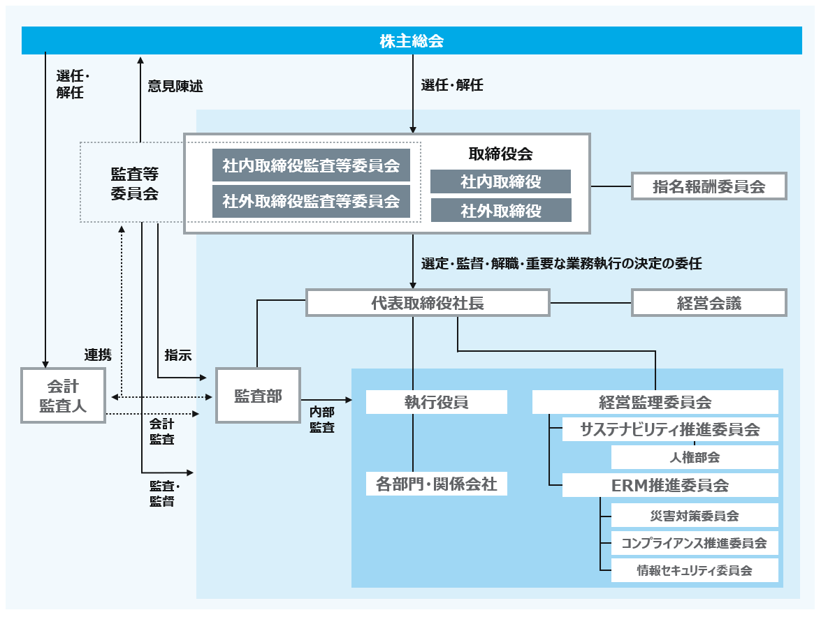 この実現に向け、コーポレート・ガバナンスの充実が経営の重要課題であるとの認識のもと、以下のようなコーポレート・ガバナンス体制を構築し、株主をはじめとするステークホルダーに対する経営責任と説明責任を果たすことを含め、健全性、透明性、効率性の高い経営体制の確立に努めています。
